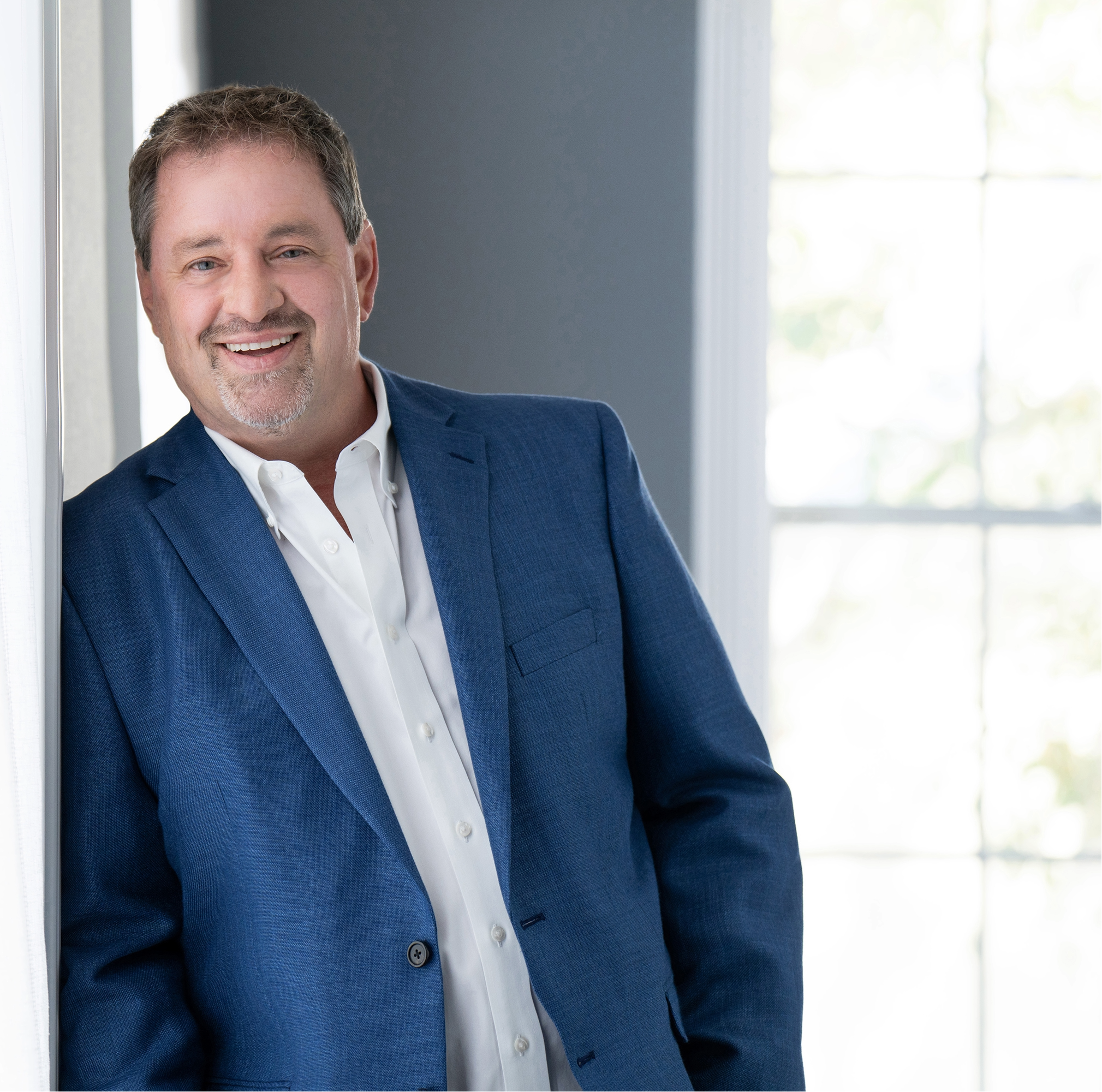 Jim Buresch, a professional in a blue suit and white shirt standing by a window in a modern office.