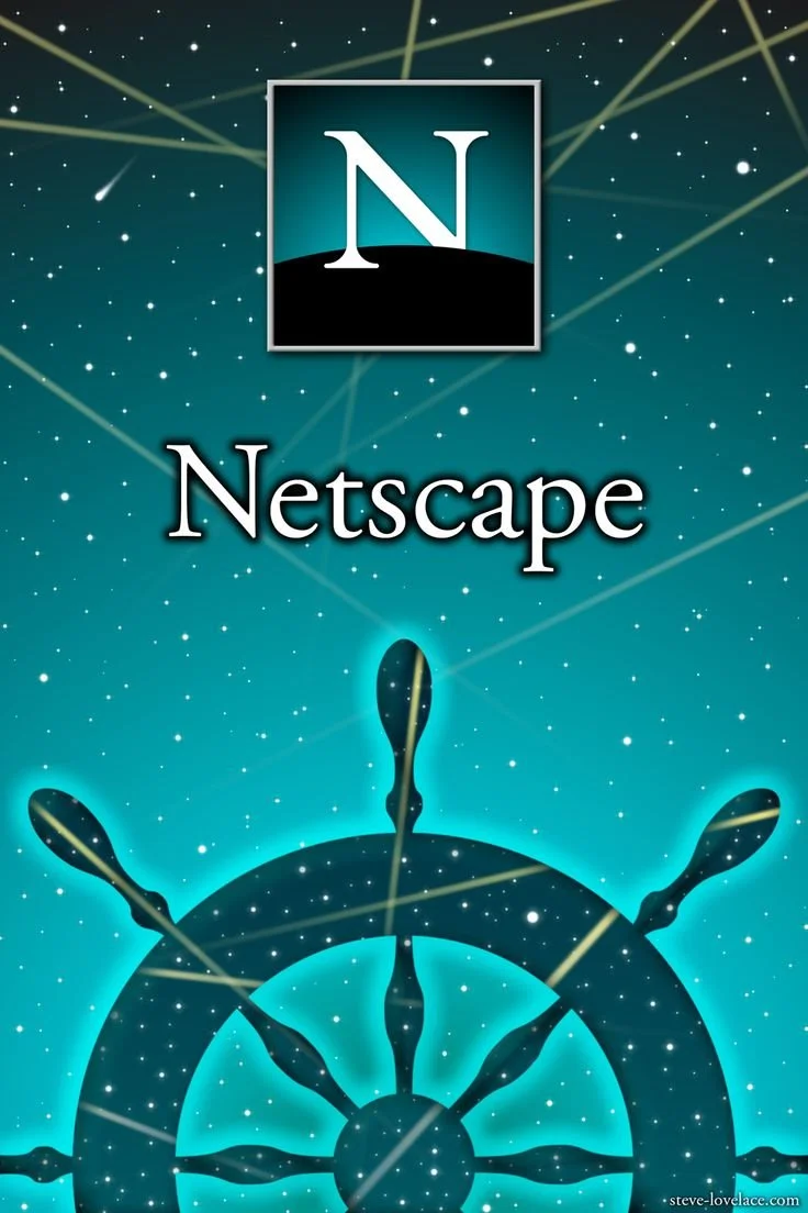 Netscape logo above a ship's steering wheel and a starry background with space lines.